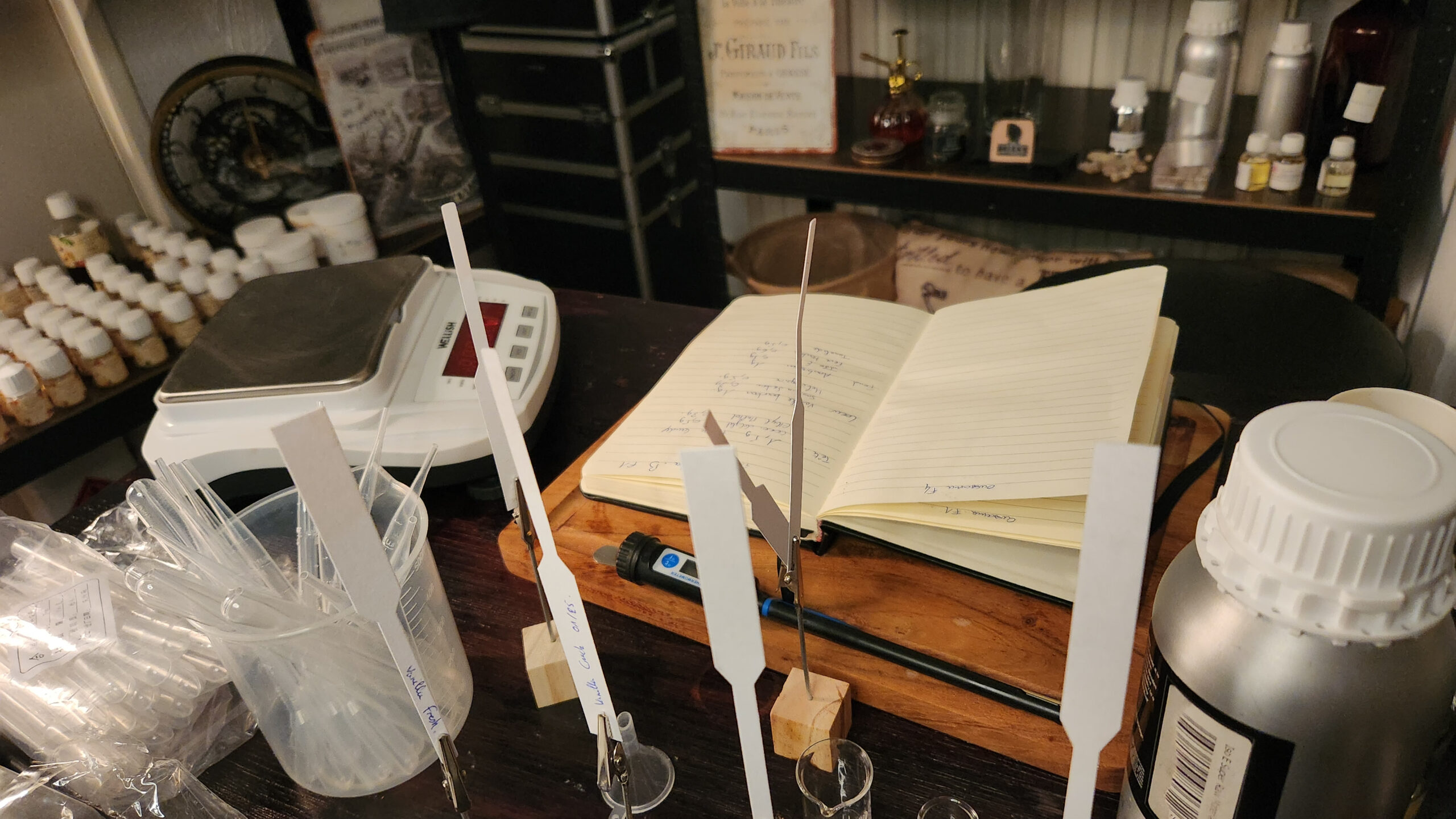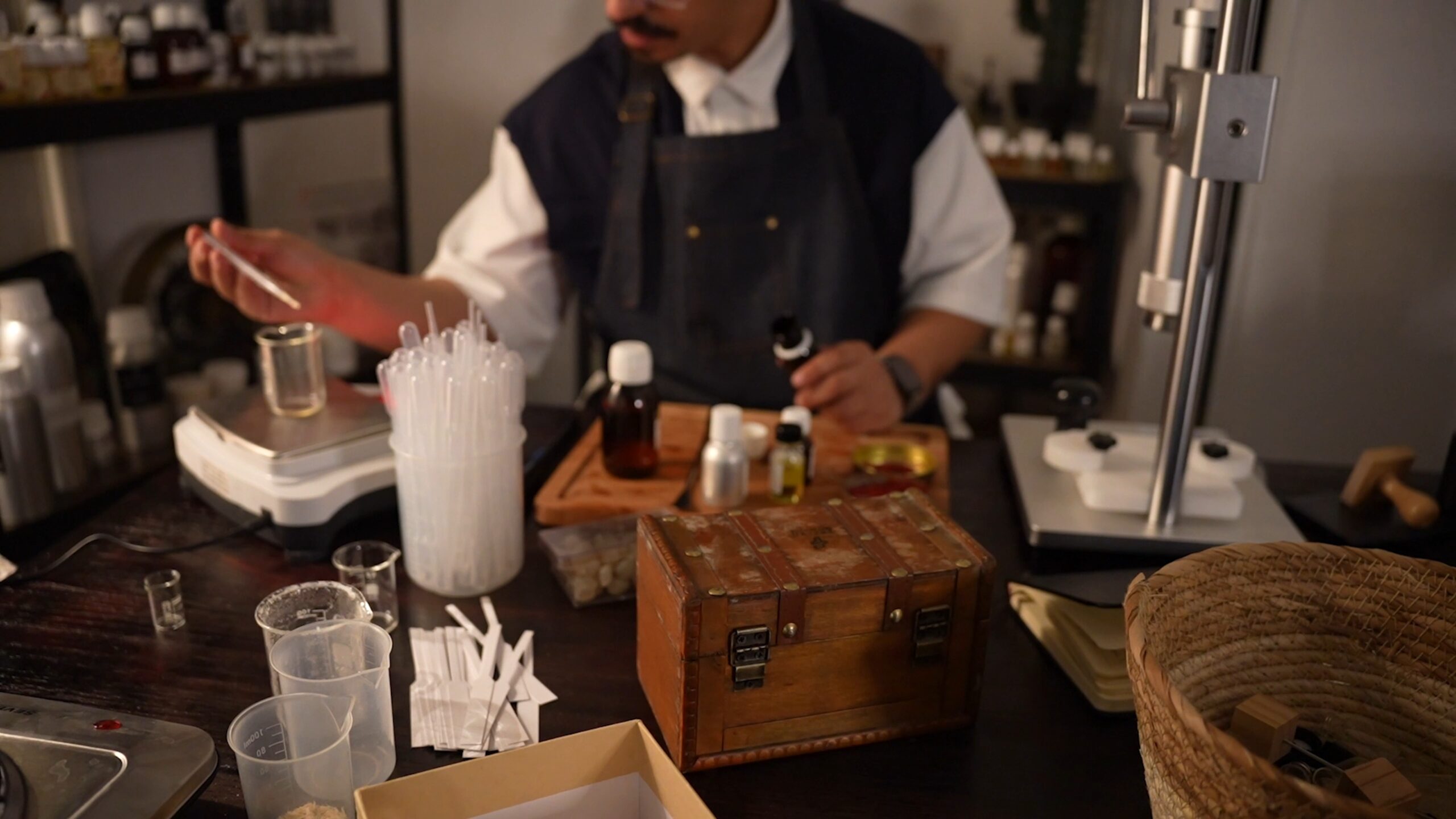 Atelier rustique, boisé, rétro-vintage, pensé pour travailler au calme et au geste. Ici, chaque parfum naît à la main, loin du bruit des chaînes industrielles.
